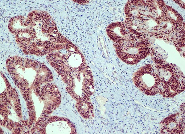 The p53 Tumor Suppressor Protein (DO-7) recognizes a 53 kDa phosphoprotein identified as the p53 suppressor gene product. It reacts with both mutant and wild type p53. It recognizes & binds to the N-terminus (aa 37-45) of p53. The p53 tumor suppressor gene has been found to contain mutations in over 50% of human cancers. It is observed that in many transformed cells there is an accumulation of P53 protein which is demonstrated through immune staining. p53 expression is found in a wide variety of malignant tumors, including breast, ovarian, bladder, colon, lung, and melanoma.